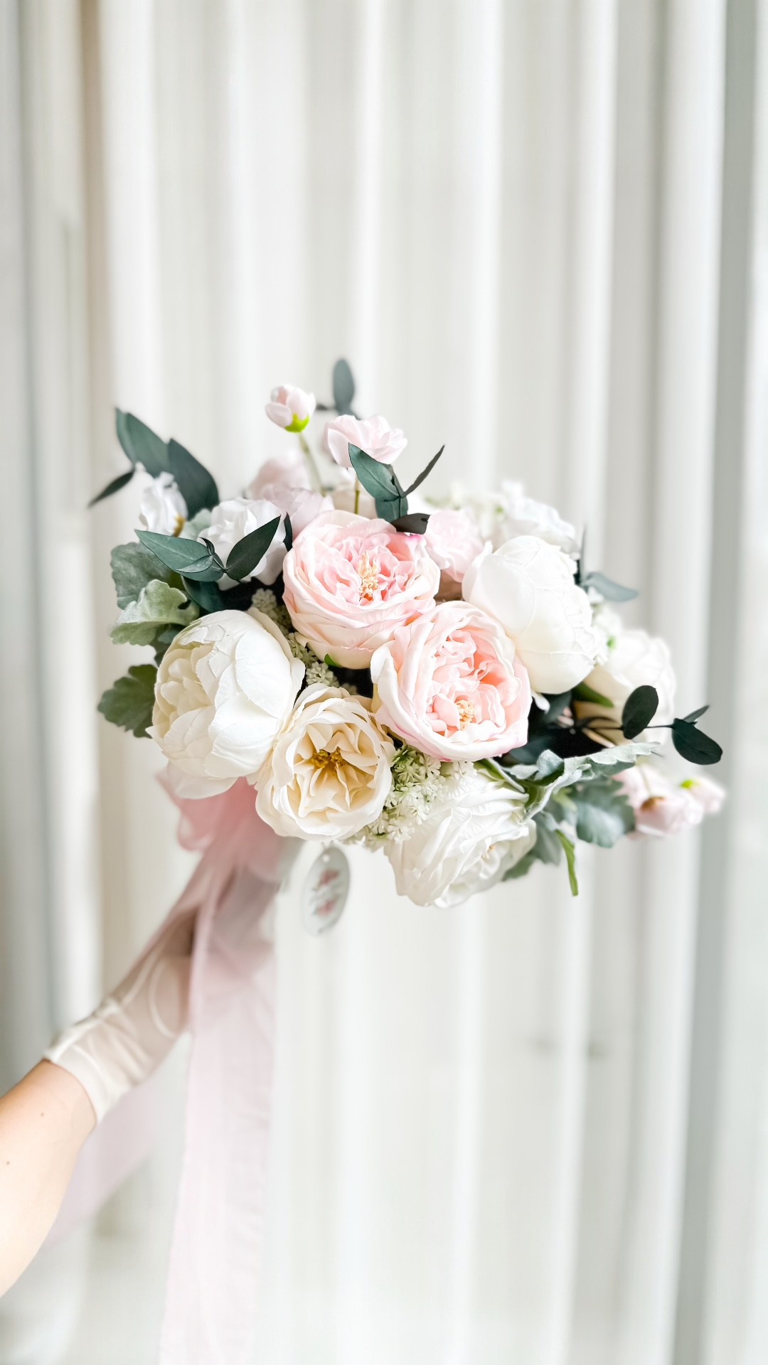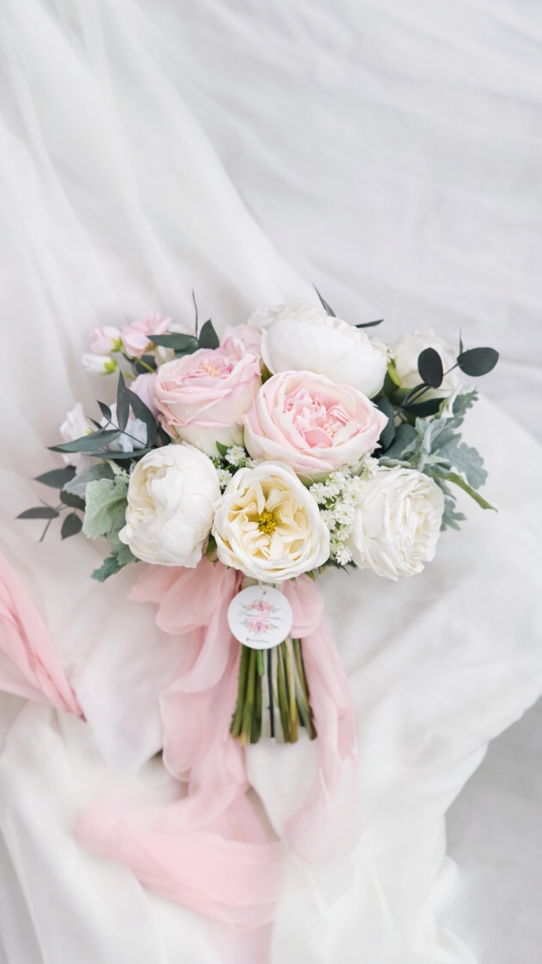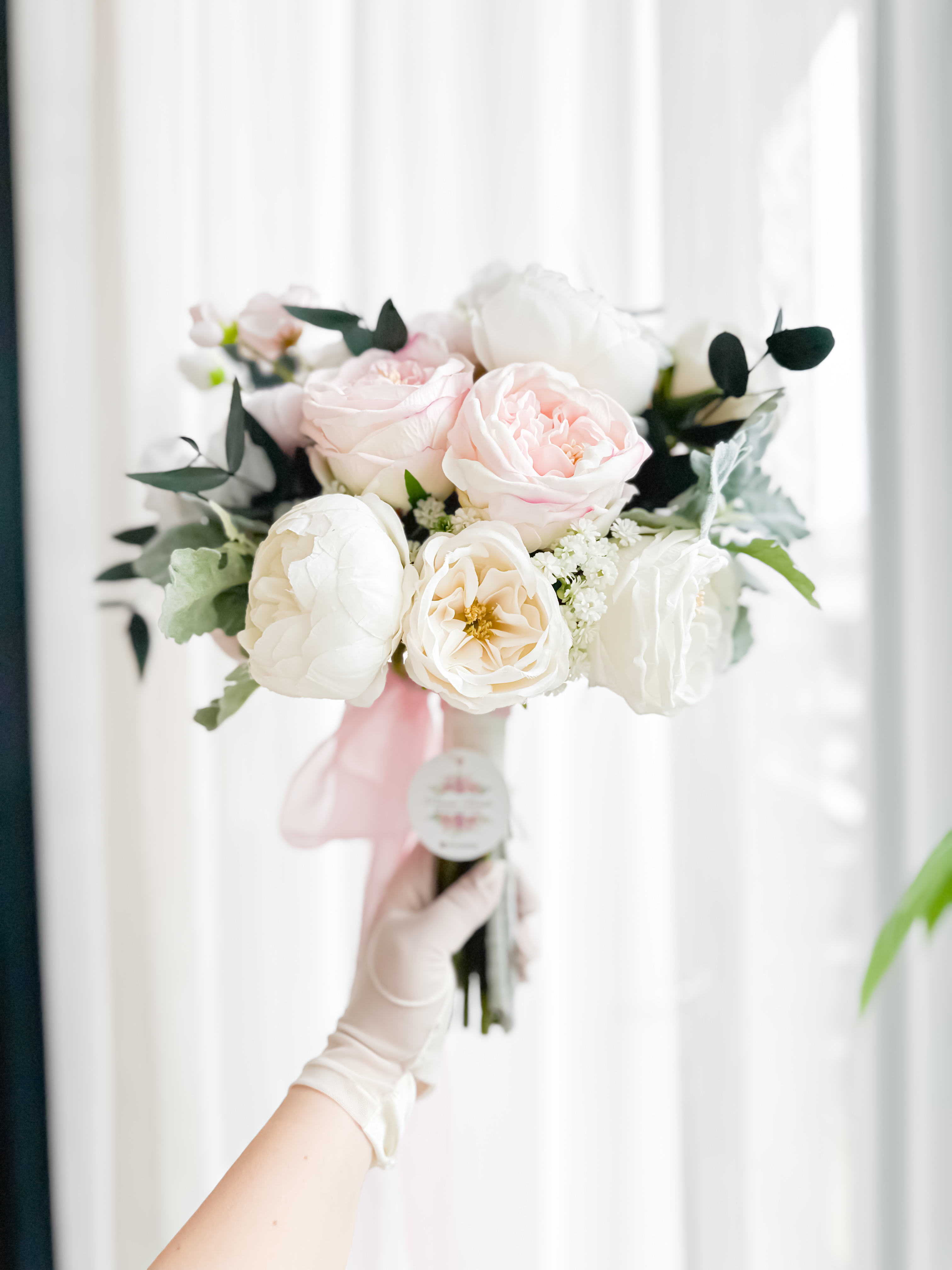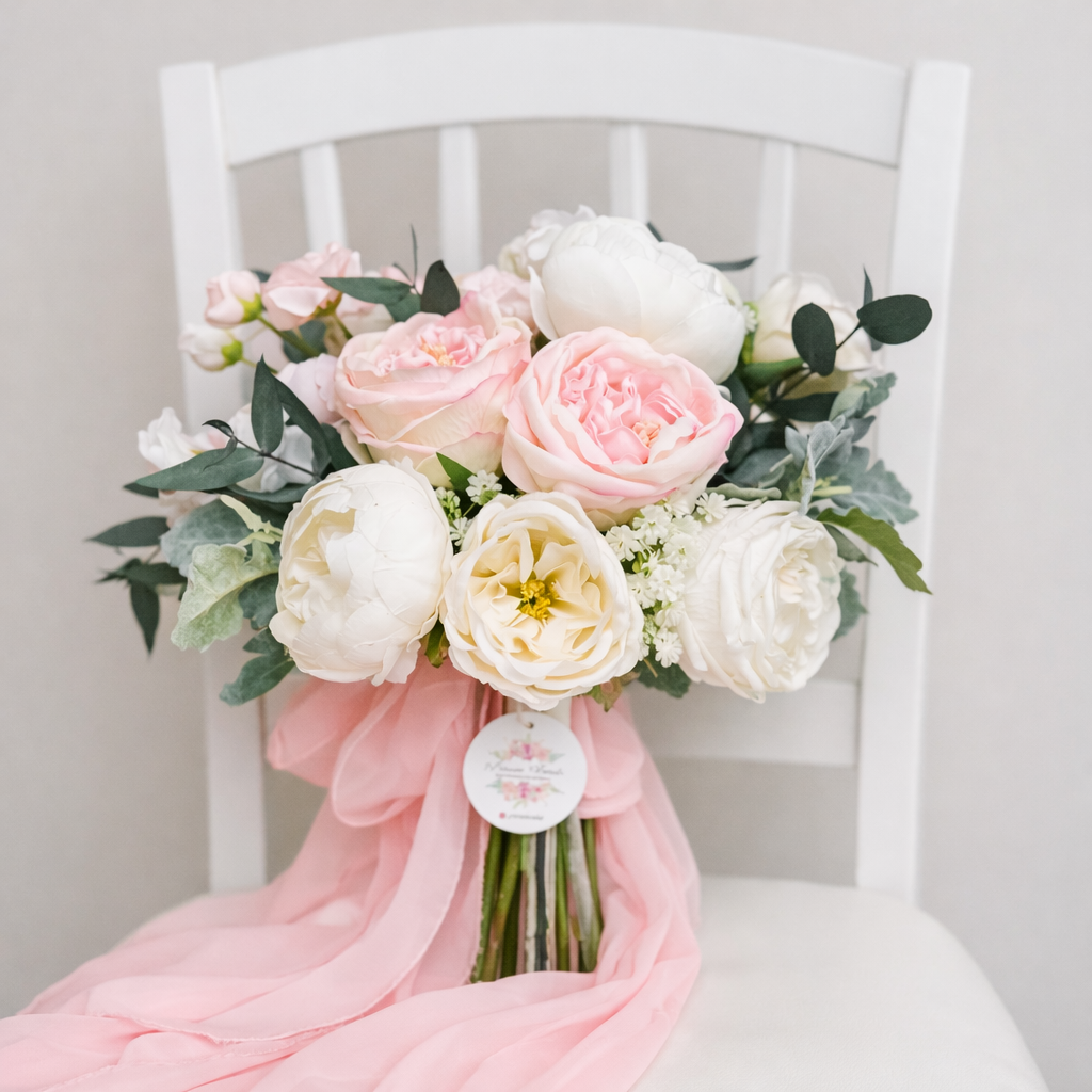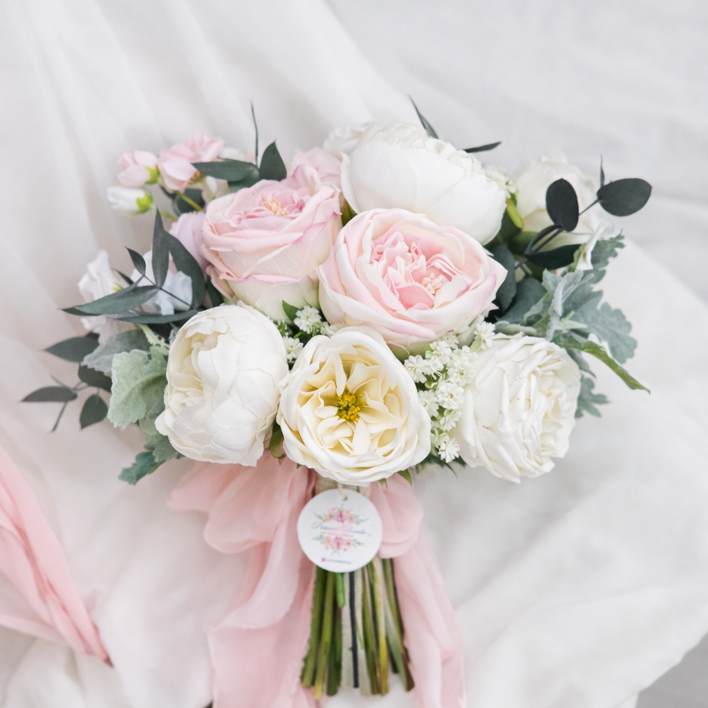 • Islak şakayık ve kumaş çiçeklerden A kalite olarak tasarlanmıştır .Okaliptusler gerçek şoklanmış okaliptustur.